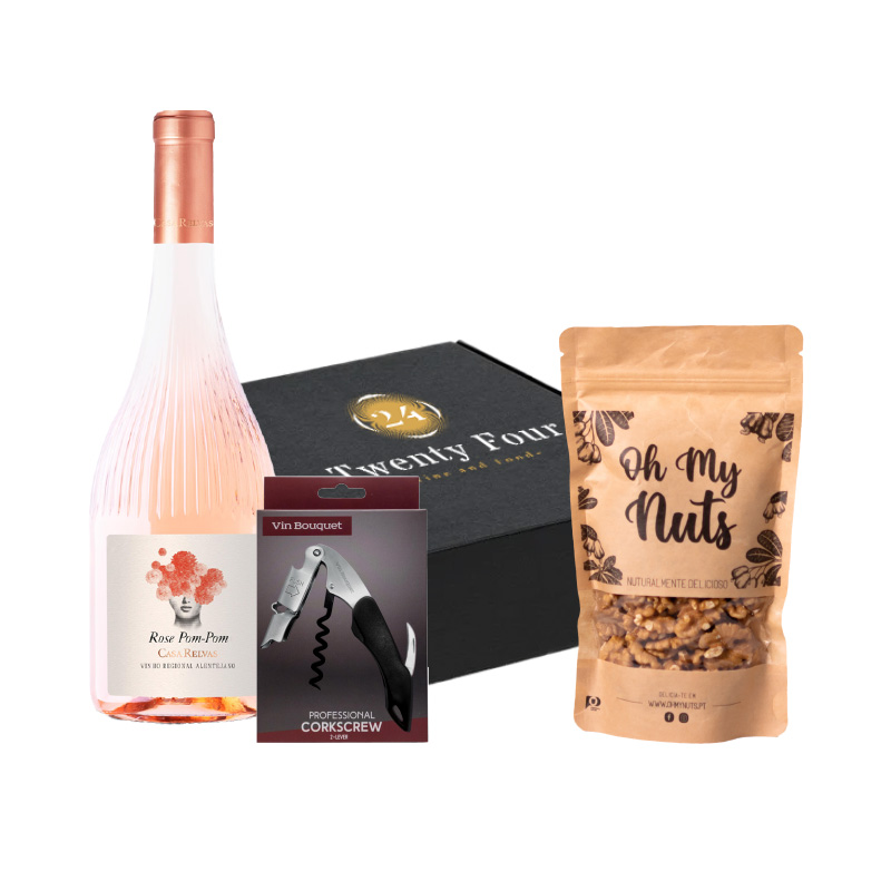 Cabaz Namorados 3 – Vinho Pom-Pom (Rosé) + Abridor + Avelã